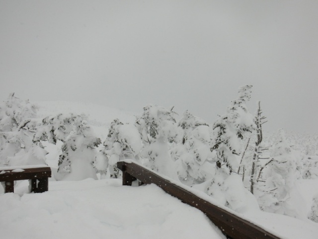 天気は小雪となり視界が悪くなりました。おまけに樹氷群は数日前の雨で